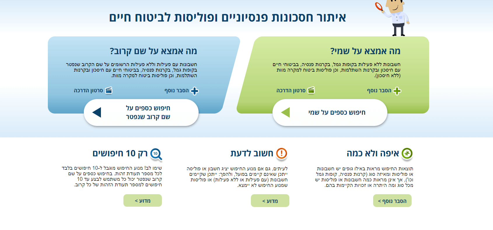 באתר 'איפה הכסף' תוכלו לקבל סיוע בנושא איתור כספים אבודים הנמצאים אצל מעסיקים לשעבר, בחברות ביטוח, או בקרנות פנסיה שונות.